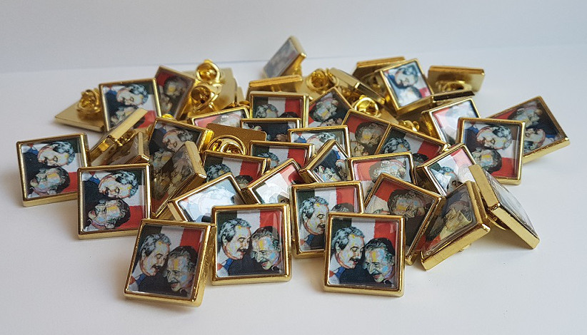 Per prevenire nel tempo l’usura e che la grafica si rovini, alle spillette e alle calamite viene applicata una pellicola trasparente che la protegge.