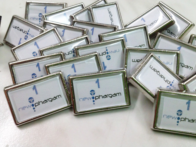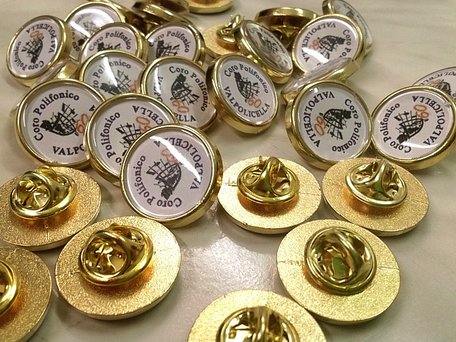 Tramite una stampante digitale che permetterà di riprodurre qualsiasi logo, scritta o immagine a colori, creiamo un inserto in carta con la vostra grafica successivamente assemblato con gli elementi che compongono le pins.